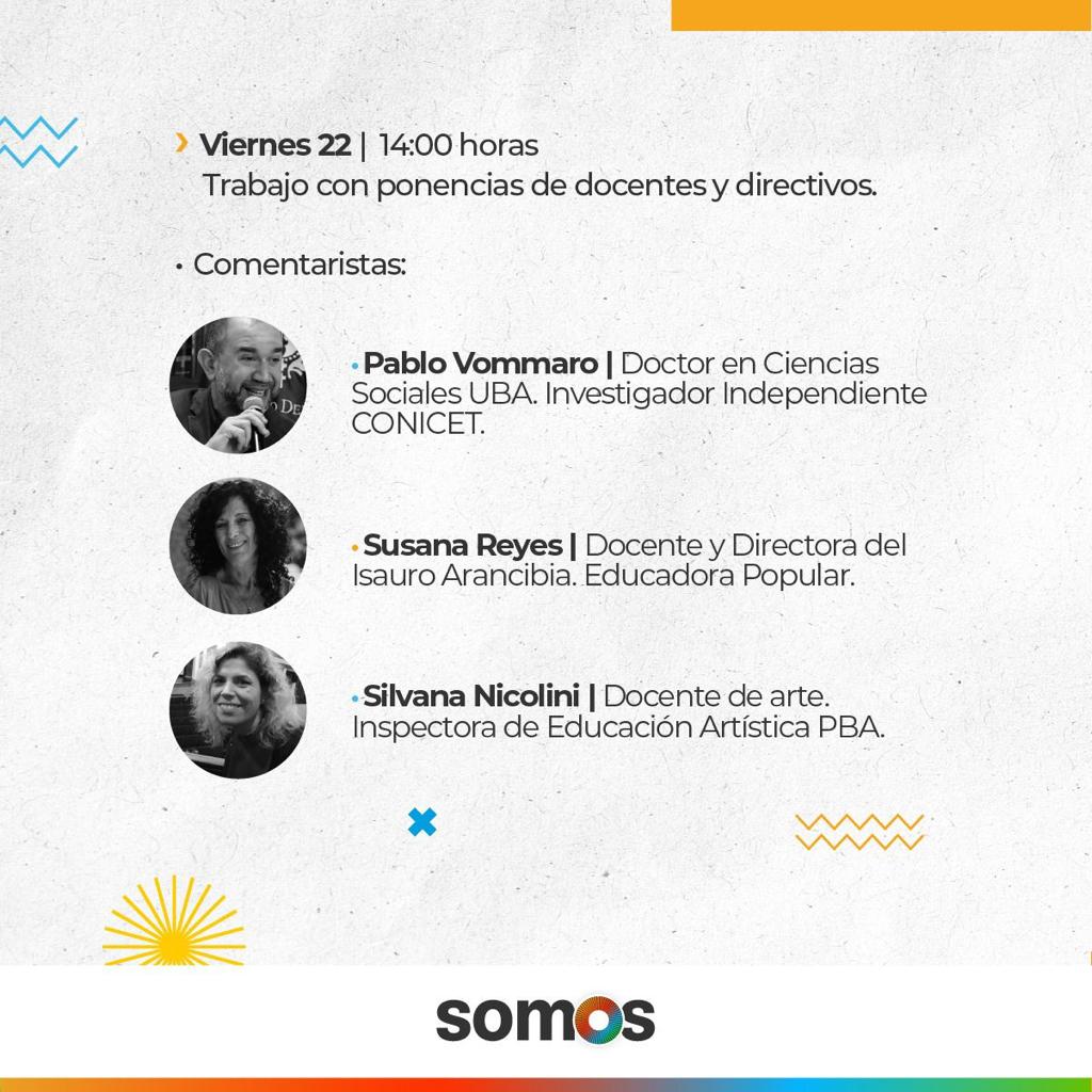 A las 14 horas de ese mismo día está programado el trabajo con ponencias docentes y directivos. Los comentaristas invitados son Pablo Vommaro, Investigador independiente del CONICET, y Susana Reyes, quien es Docente y Directora del Isauro Arancibia. Silvana Nicolini, inspectora de Educación Artística de la Provincia de Buenos Aires, y Analía Kalinec, Integrante y miembro fundadora del Colectivo Historias Desobedientes, también participarán como comentaristas de esta etapa. A este equipo también se suman Ana Nanfara, directora de Secundaria en Conquinbito, Mendoza, y Adrian Monteleone, especialista en educación ambiental.