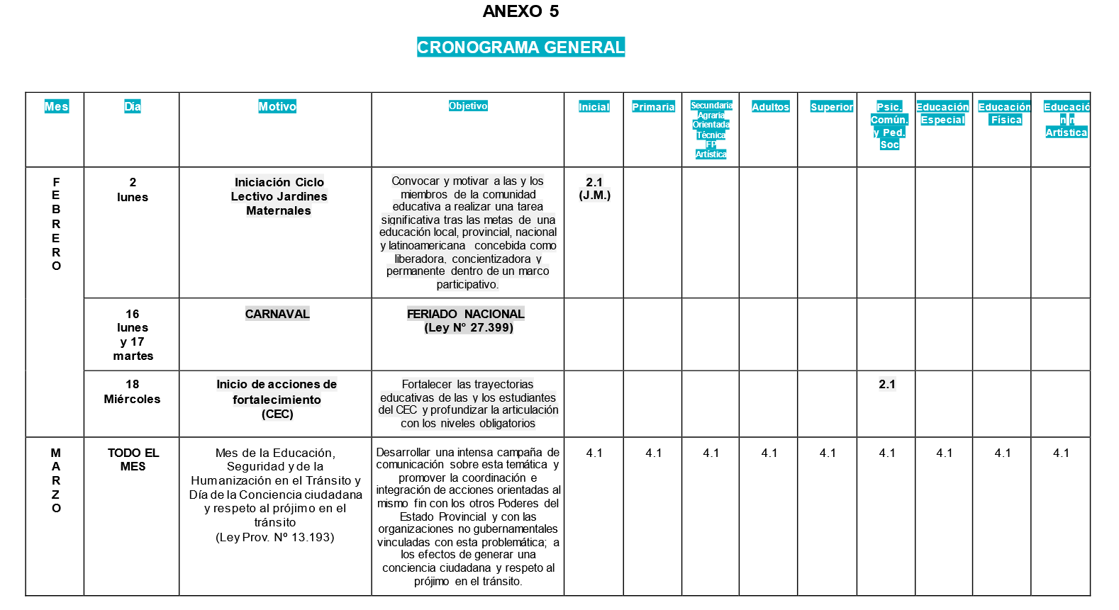 En la Educación Primaria el cronograma contempla los diferentes espacios curriculares, entre ellos Educación Física, Educación Artística y el trabajo de los Equipos de Orientación Escolar. Para la Educación en Formación Profesional, por otro lado, el inicio de clases está previsto para el 9 de marzo, con un cierre esperado para el 18 de diciembre.